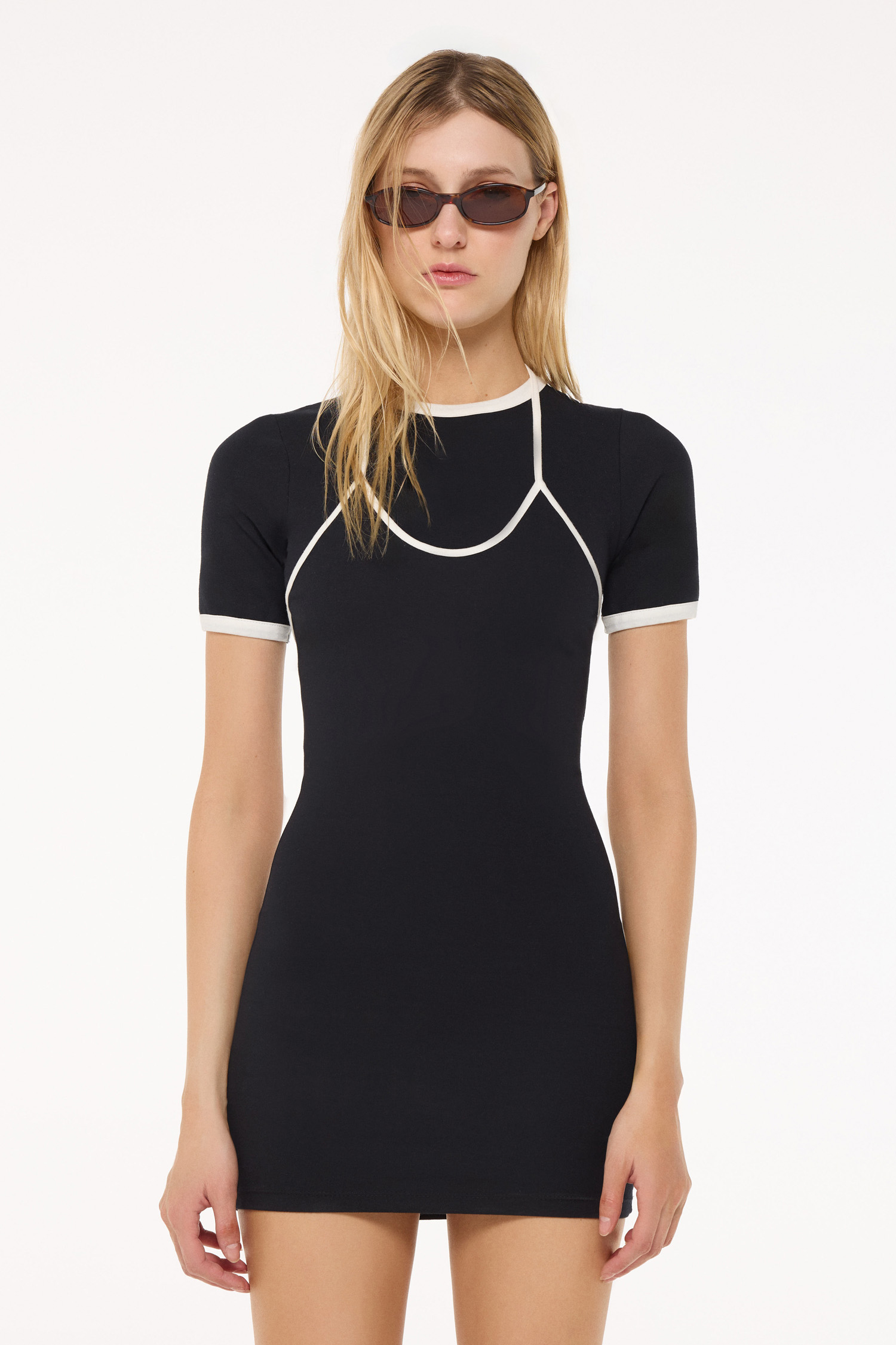 VESTIDO DE ALGOCÓN CON ELASTANO CON FIT AL CUERPO. SU COMBINACIÓN DE COLORES Y SUPERPOSICIÓN DE RECORTES, CREAN UN EFECTTO VISUAL DE UNA REMERA SOBRE UN VESTIDO MEGA CANCHERO