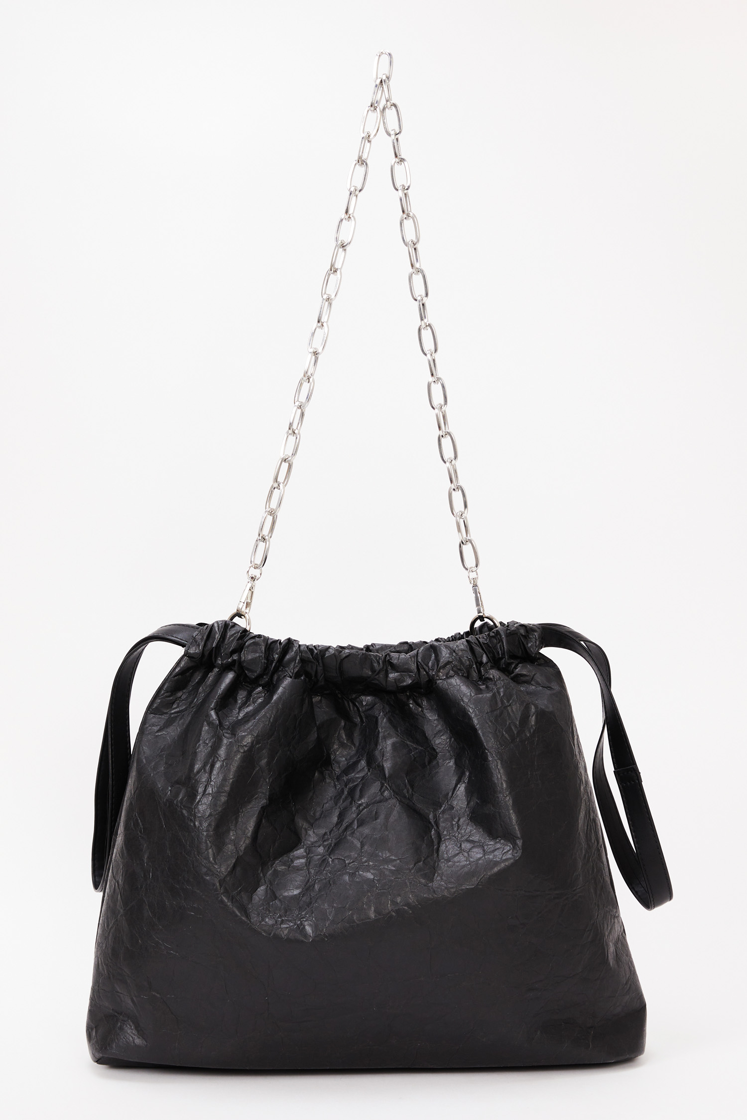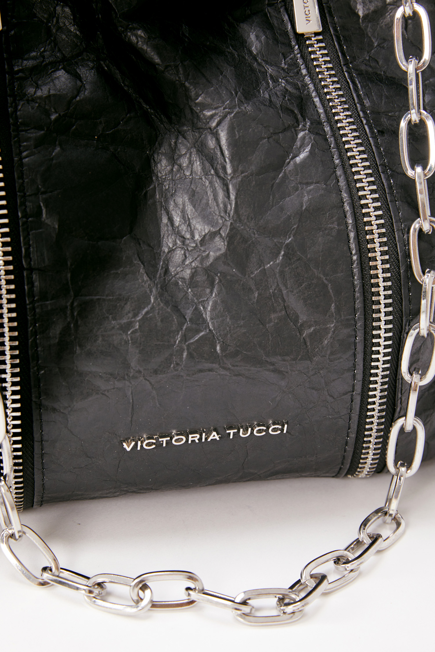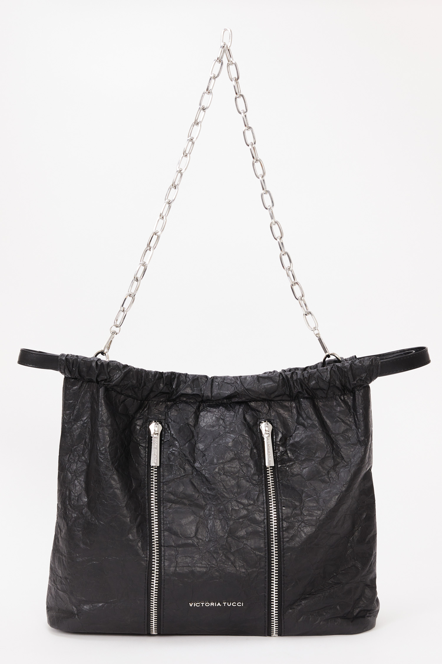 Cartera confeccionada en un material impermeable, con efecto arrugado y estructura blanda. Su medida es grande como para llevar lo que quieras y que te acompañe todo el día. Posee una cadena metálica bañada en color peltre y su acceso es mediante un mecanismo de ajuste diseñado específicamente para la misma. Se destaca por los dos cierres metálicos decorativos que tiene en su frente. Al poseer una estructura blanda permite generar diferentes formas y adaptarse según su relleno. Esta cartera tiene un bolsillo interior y forreria personalizada de la marca. Medidas: 40 cm x 30 cm