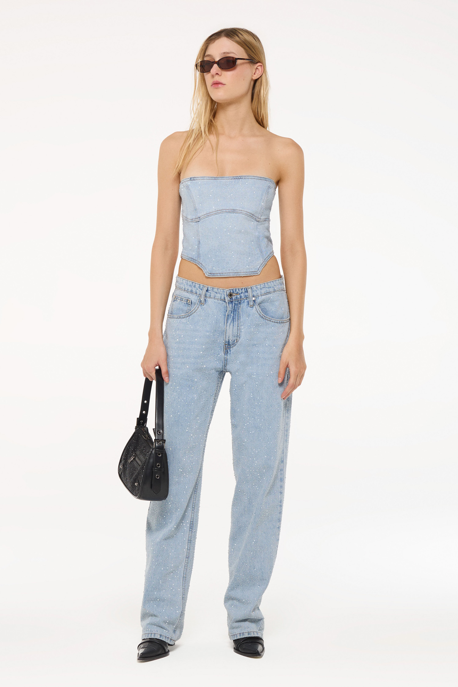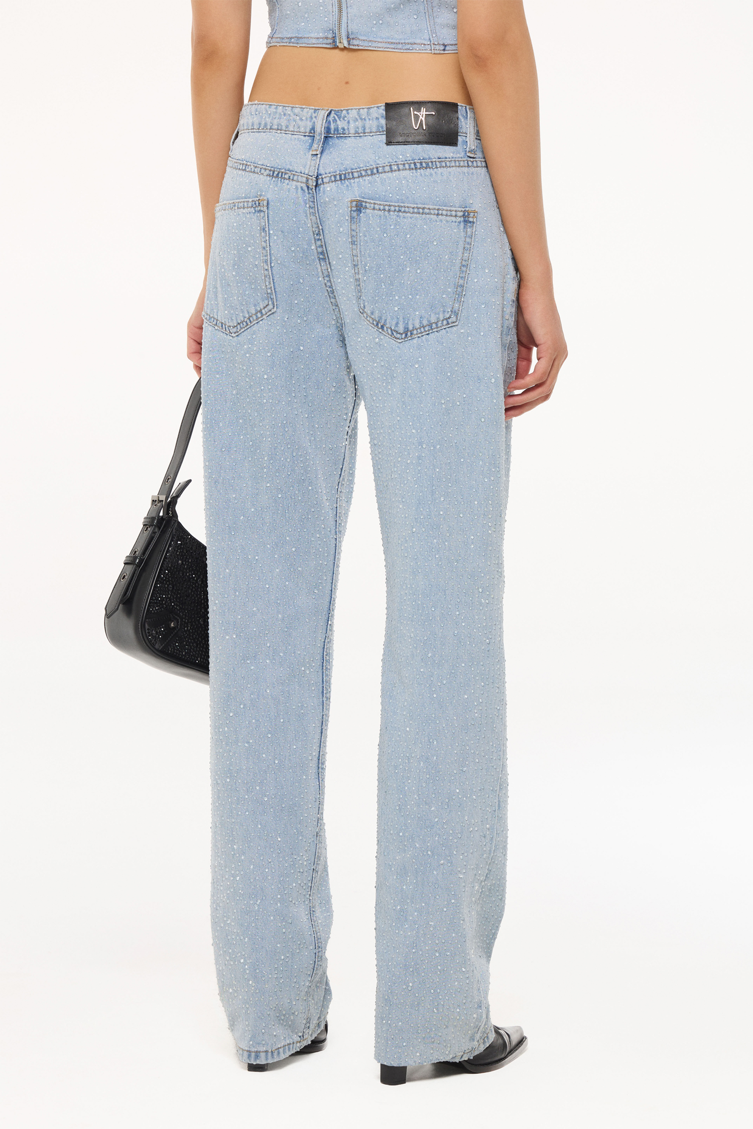PANTALÓN DE DENIM 100% ALGODÓN CON HOTIFX TRANSPARENTES DE DISTINTOS TAMAÑOS EN TODA LA PRENDA