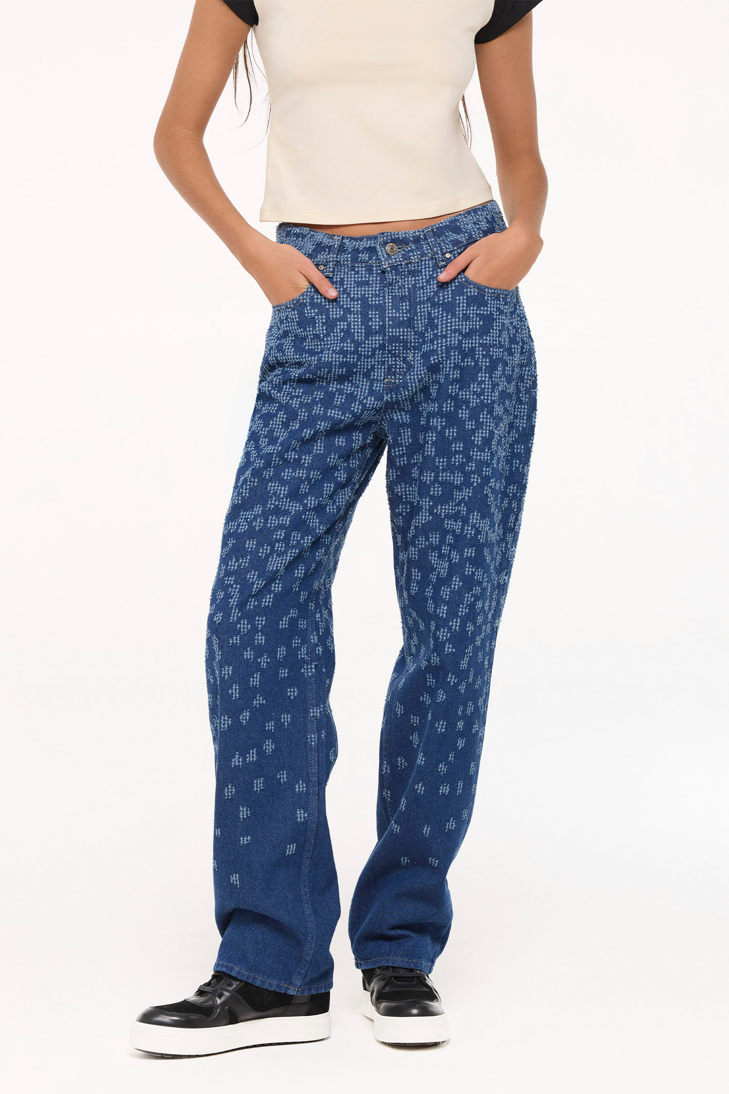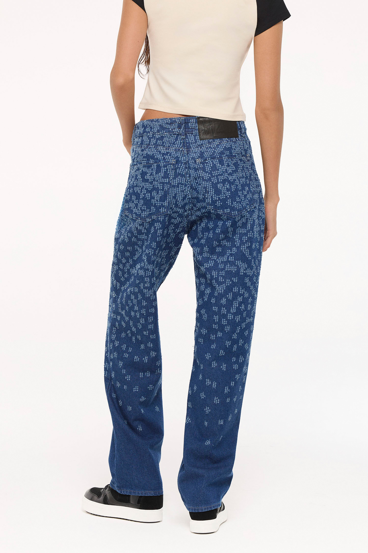 Pantalon de denim wide leg, fit tiro alto, 100% algodón. Gracias a proceso con perforado tiene una vuelta rockera. Su lavado mid blue oscuro intenso lo hace super versatil en su uso. Metales exclusivos de la marca color plata vieja.