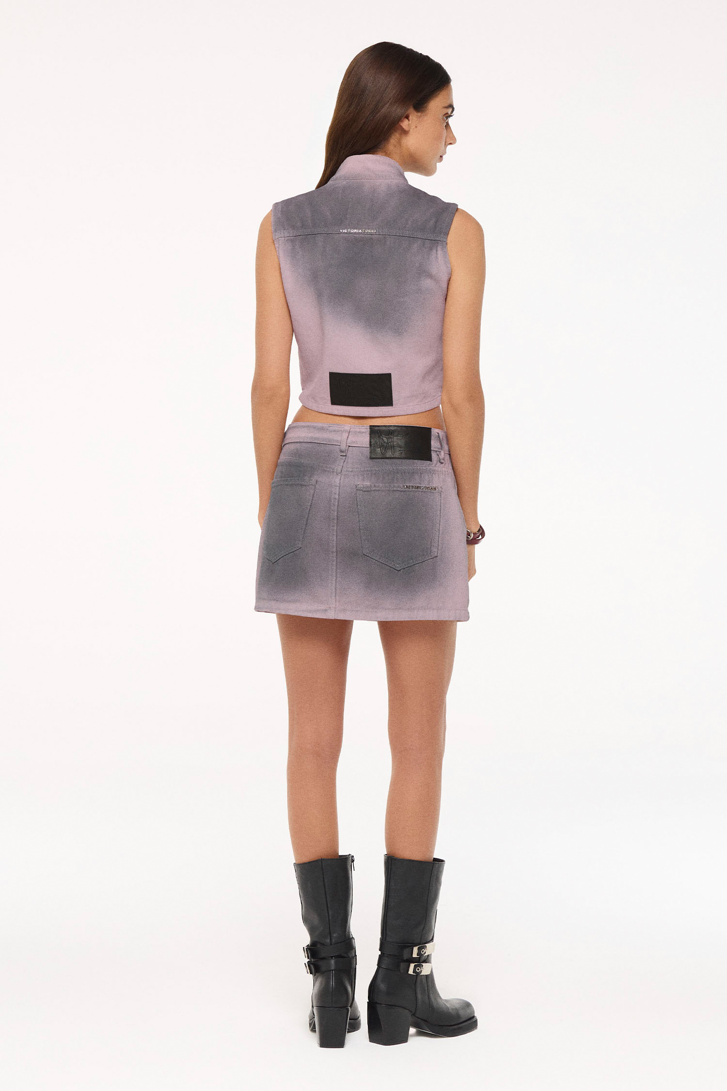 Chaleco de denim crop con recortes en el delantero y cierre desmonntable en el frente de la prenda.Un item mega en tendencia. Tejido especial 100% algodón. Tiene un teñido rosa viejo con un matizado irregular color violaceo oscuro. Combianala para el total look con nuestro Chaleco Fever.