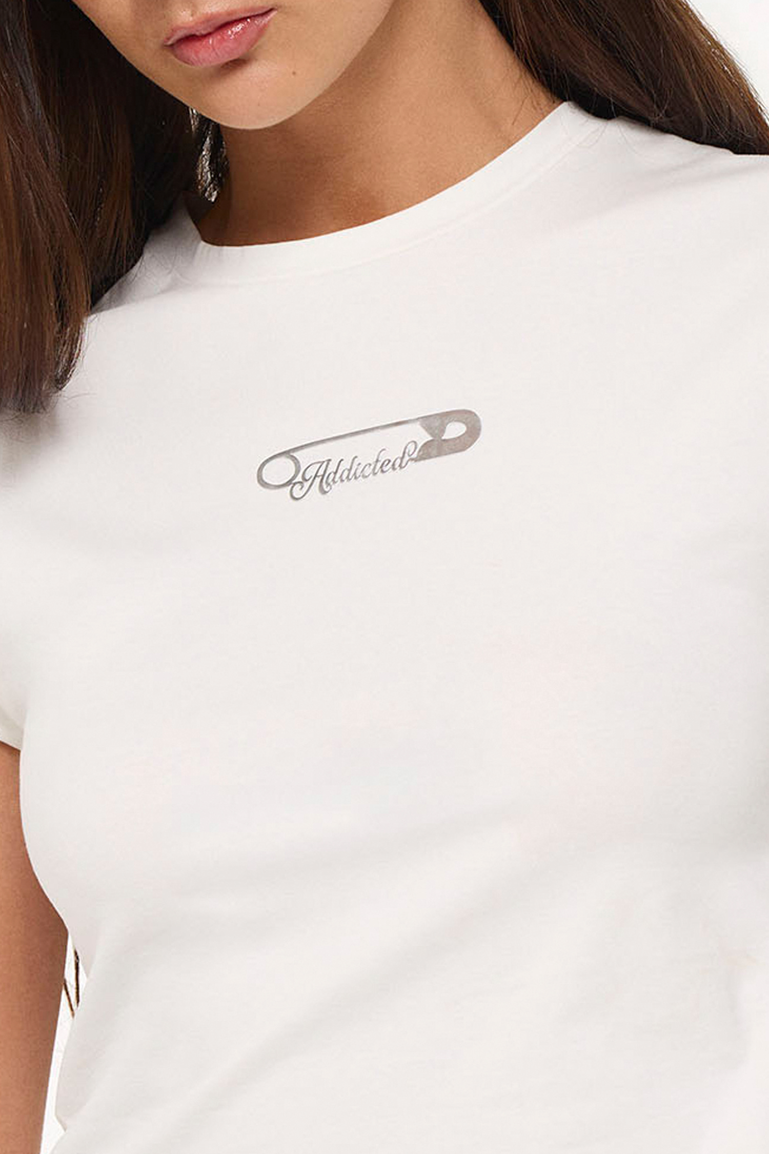 REMERA DE ALGODÓN CON SPANDEX CON FIT AL CUERPO. TIENE UNA ESTAMPA CON RELIEVE Y EFECTO METALICO DE UNO DE NUESTROS ELEMENTOS FAVORITOS