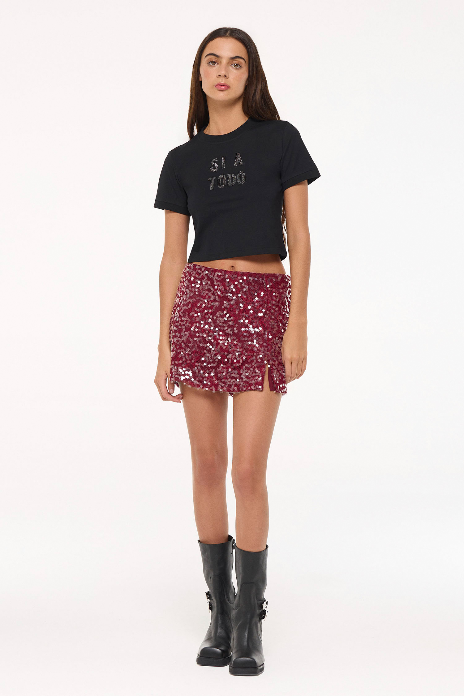 REMERA DE ALGODÓN CON SPANDEX CON FIT AL CUERPO. TIENE UNA ESTAMPA CON HOTFIX