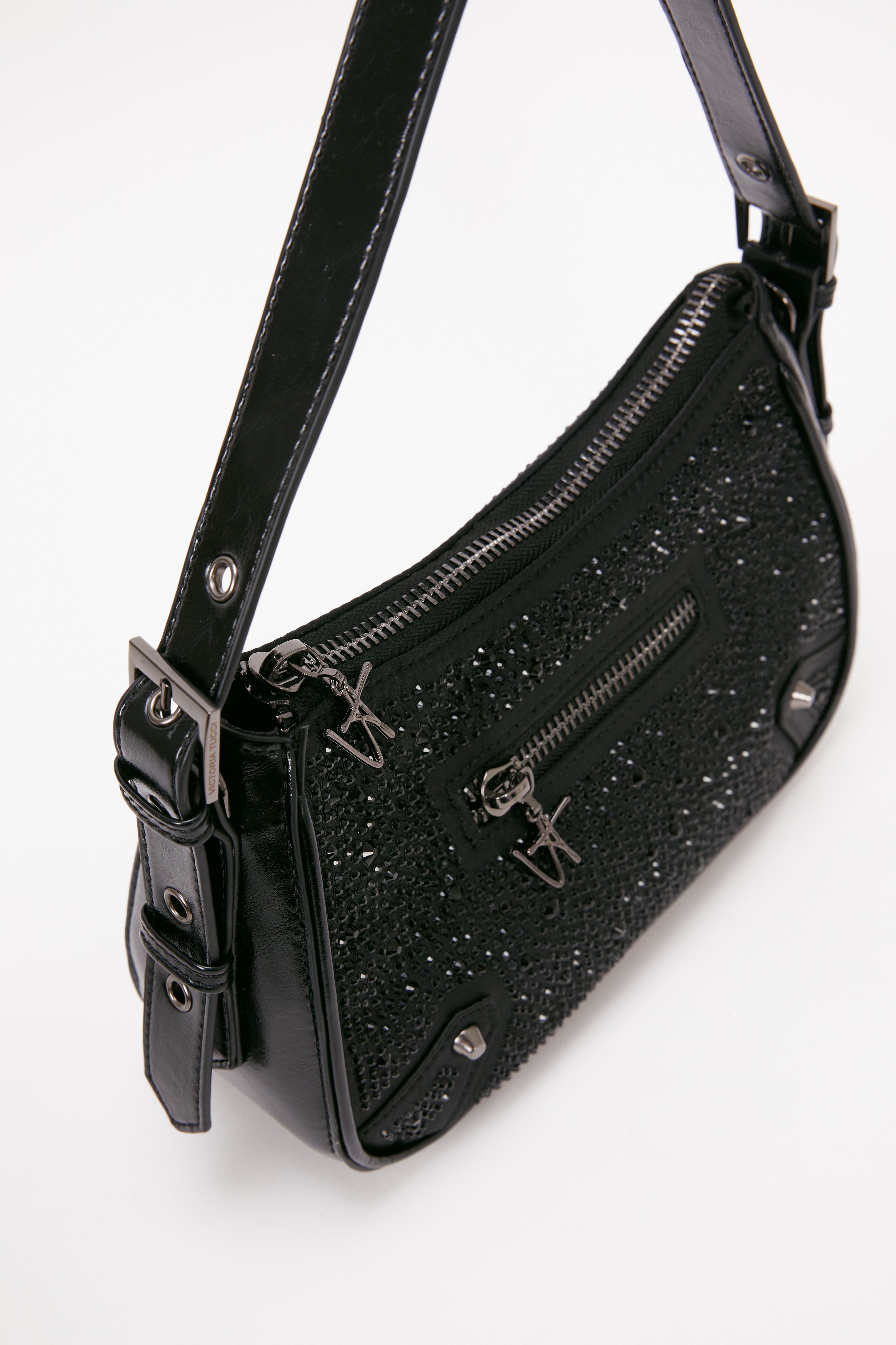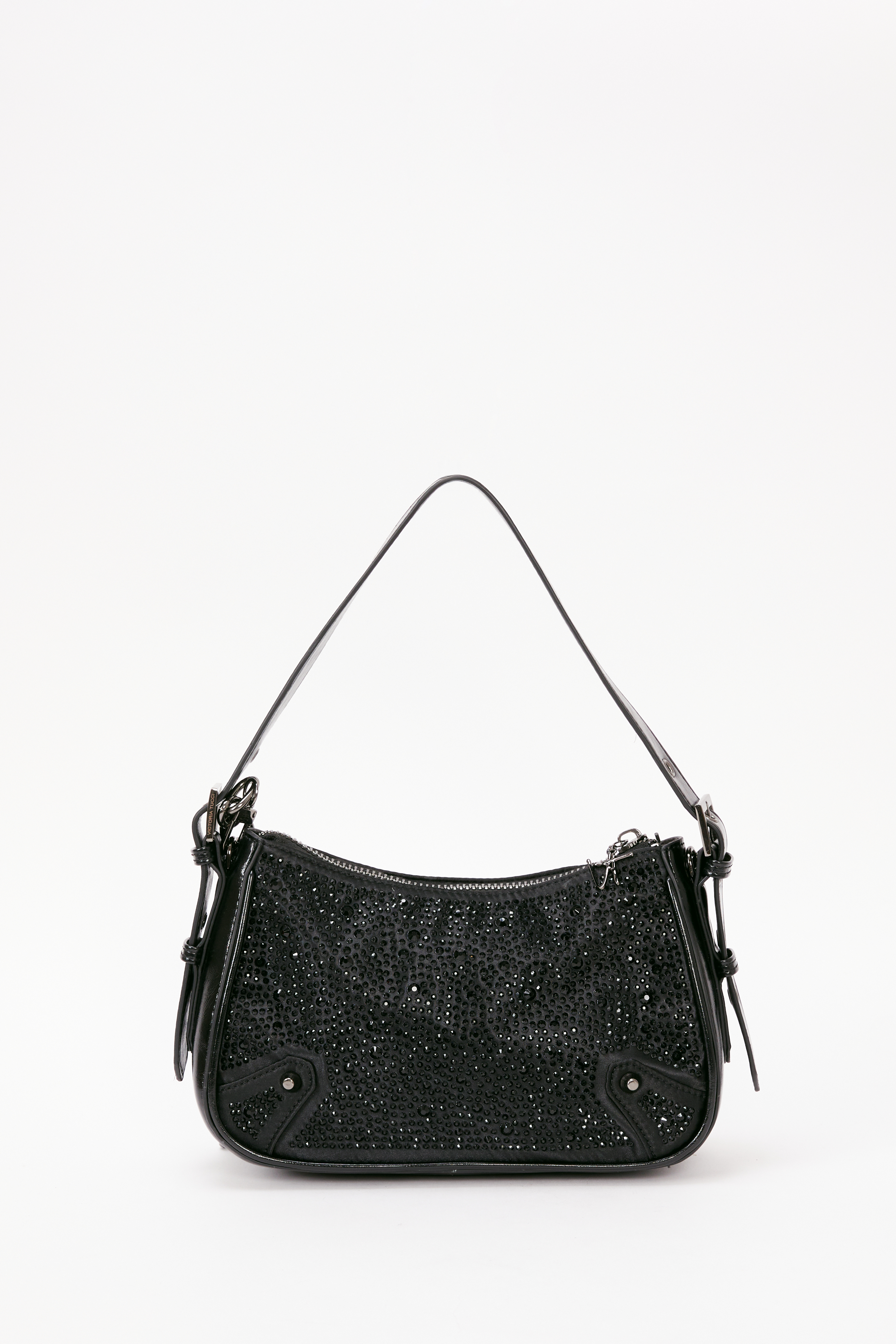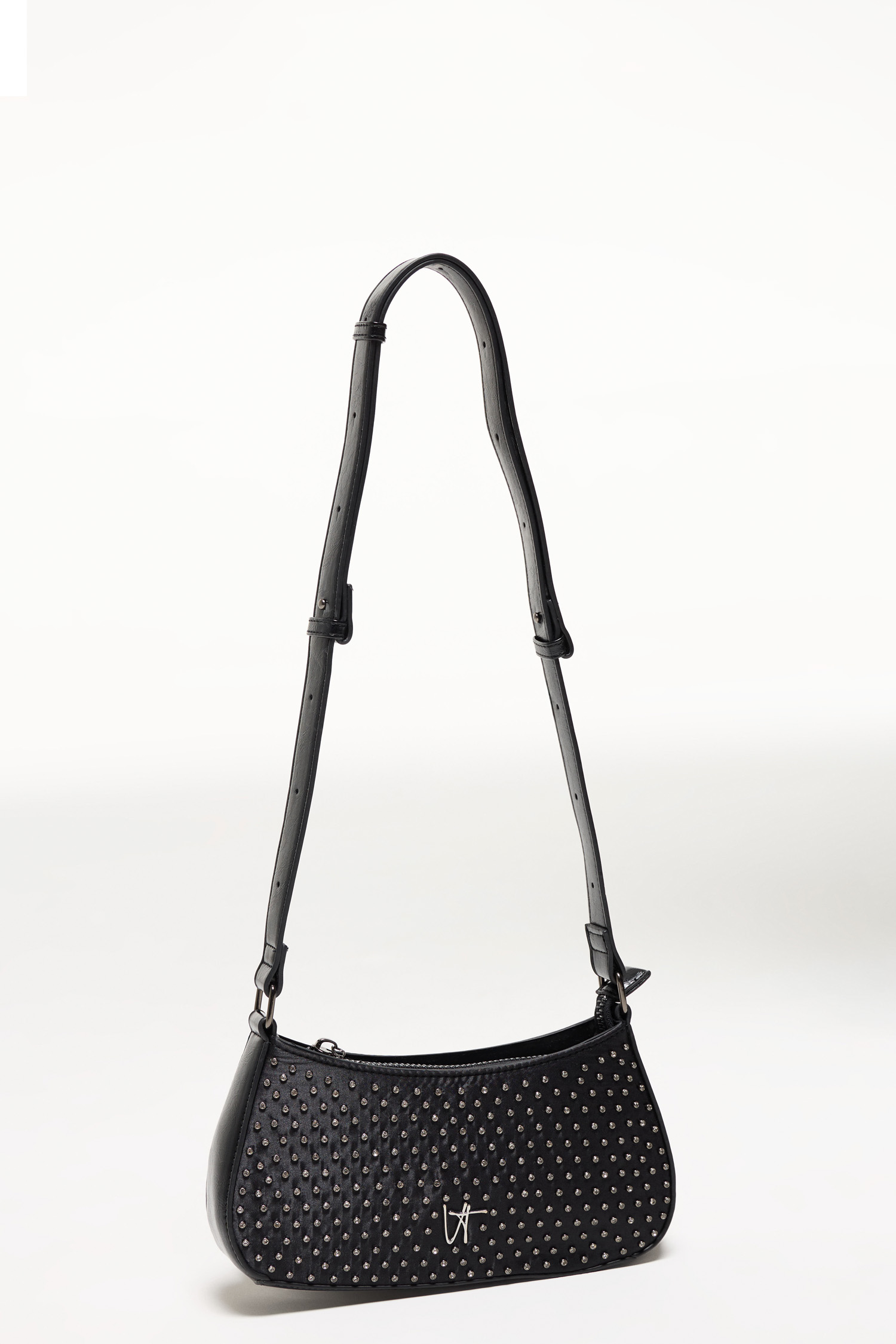 Confeccionada en satén con lluvia de strass, la cartera Glow combina elegancia con un toque rockero. Posee cierre metálico central con tira cierre personalizado y manija regulable con hebillas y ojalillos. Un modelo versátil y canchero, ideal para elevar cualquier outfit.