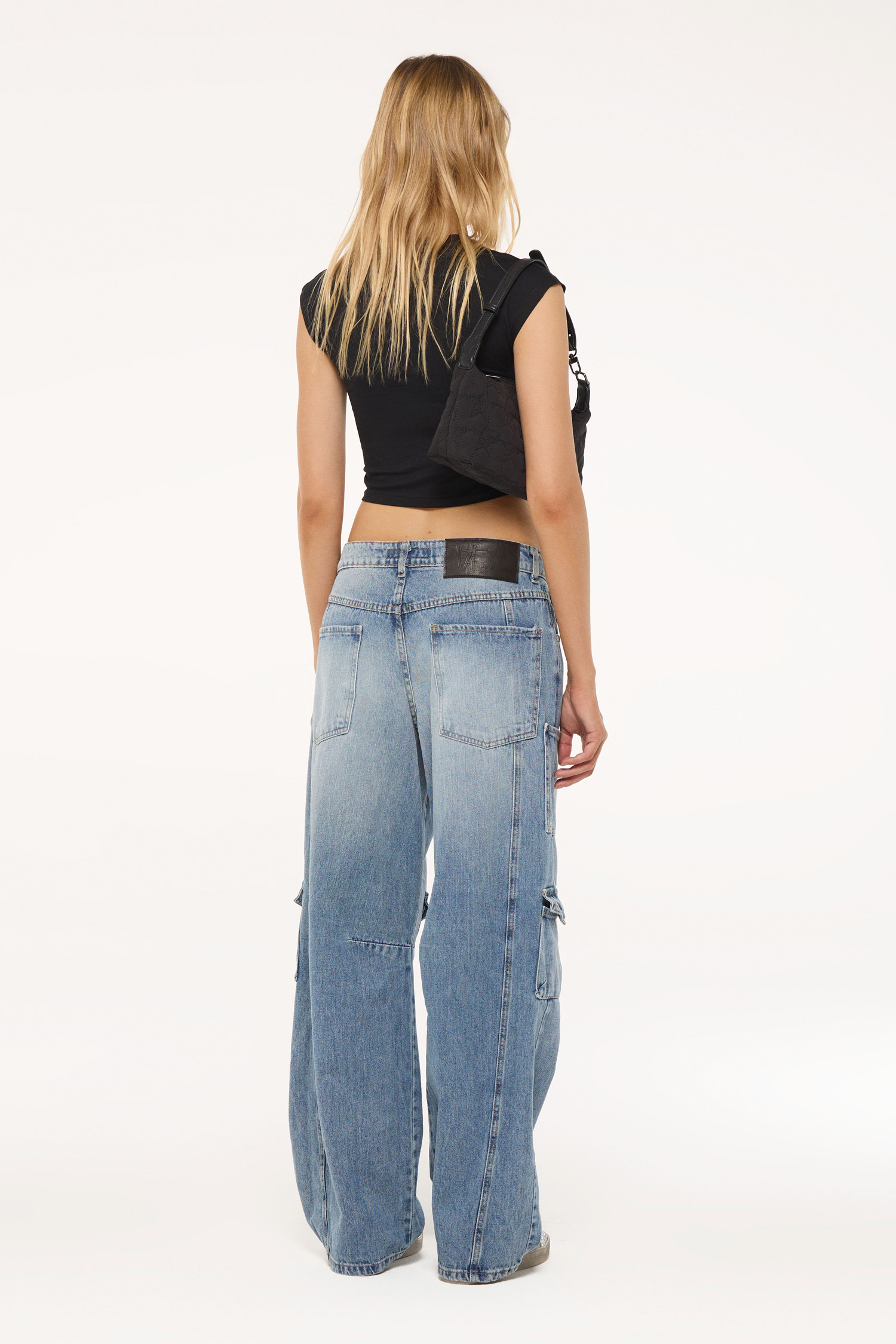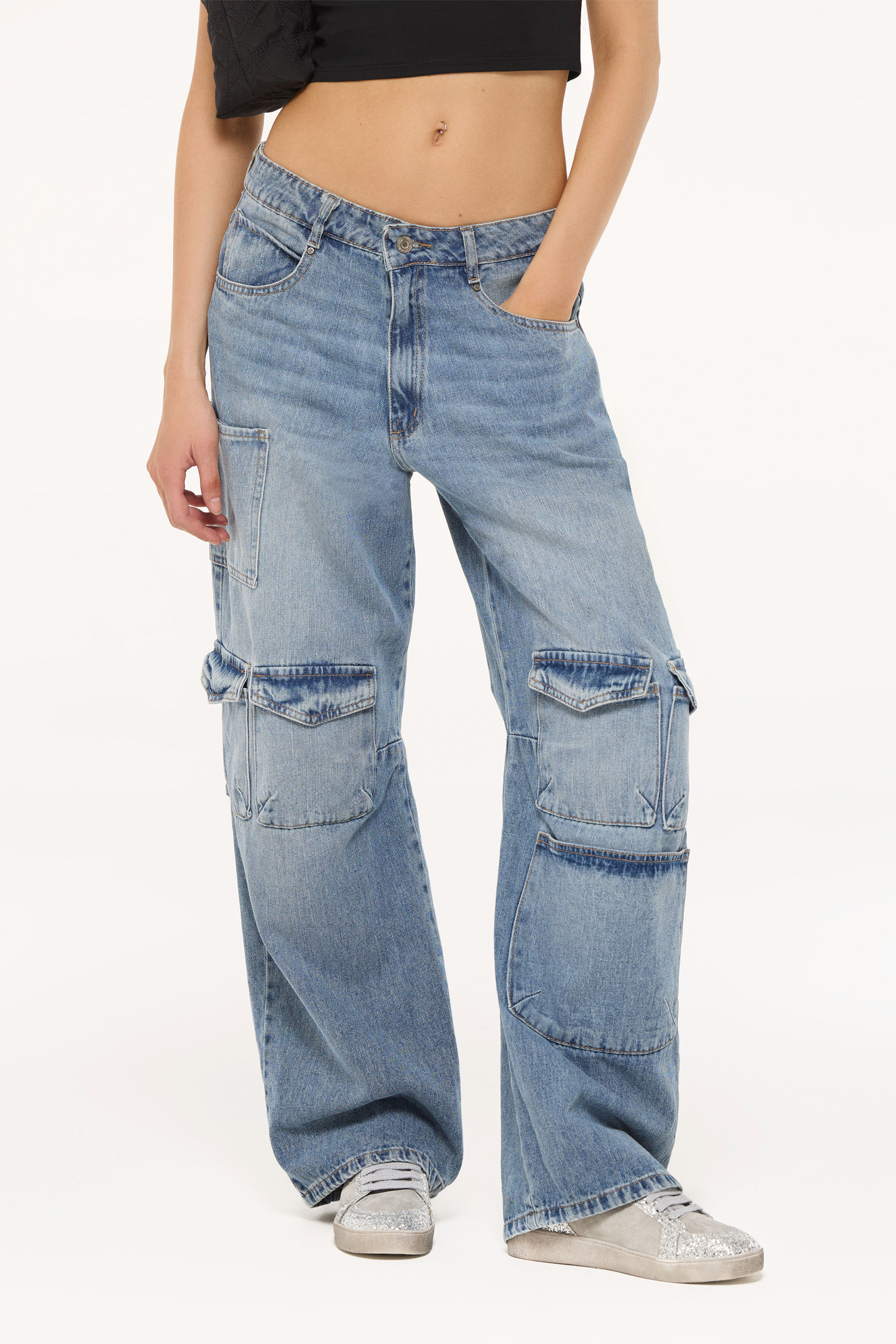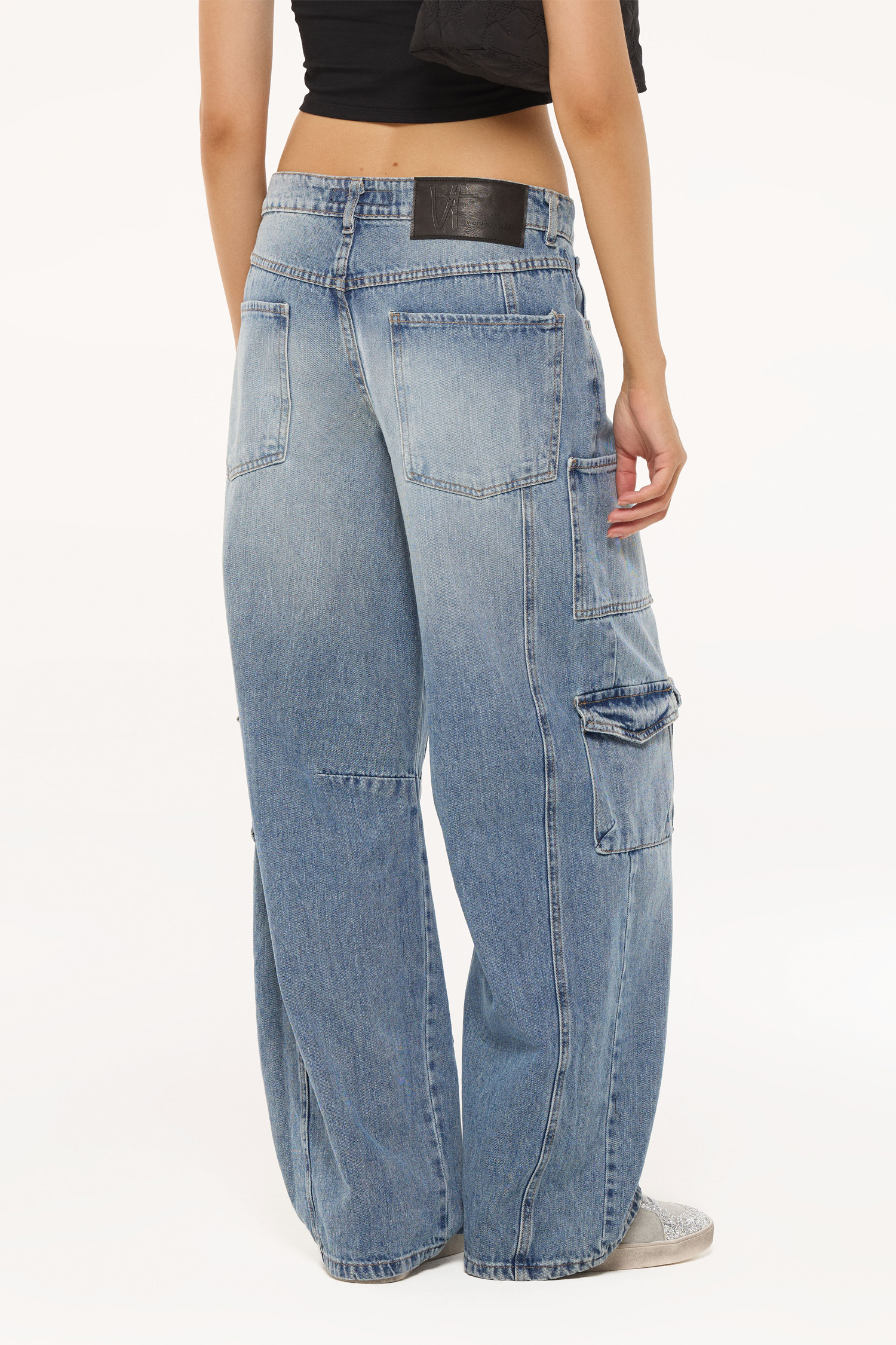 Pantalón de denim tiro medio fit barrel confeccionado en tejido 100% algodón, lavado indigo medio con efecto envejecido. Combina un fit en hiper tendencia con la estética de un pantalón cargo. Con múltiples bolsillos delanteros es ideal para quienes buscan un look con mucho carácter. Botón, remaches y badana exclusivos de la marca.
