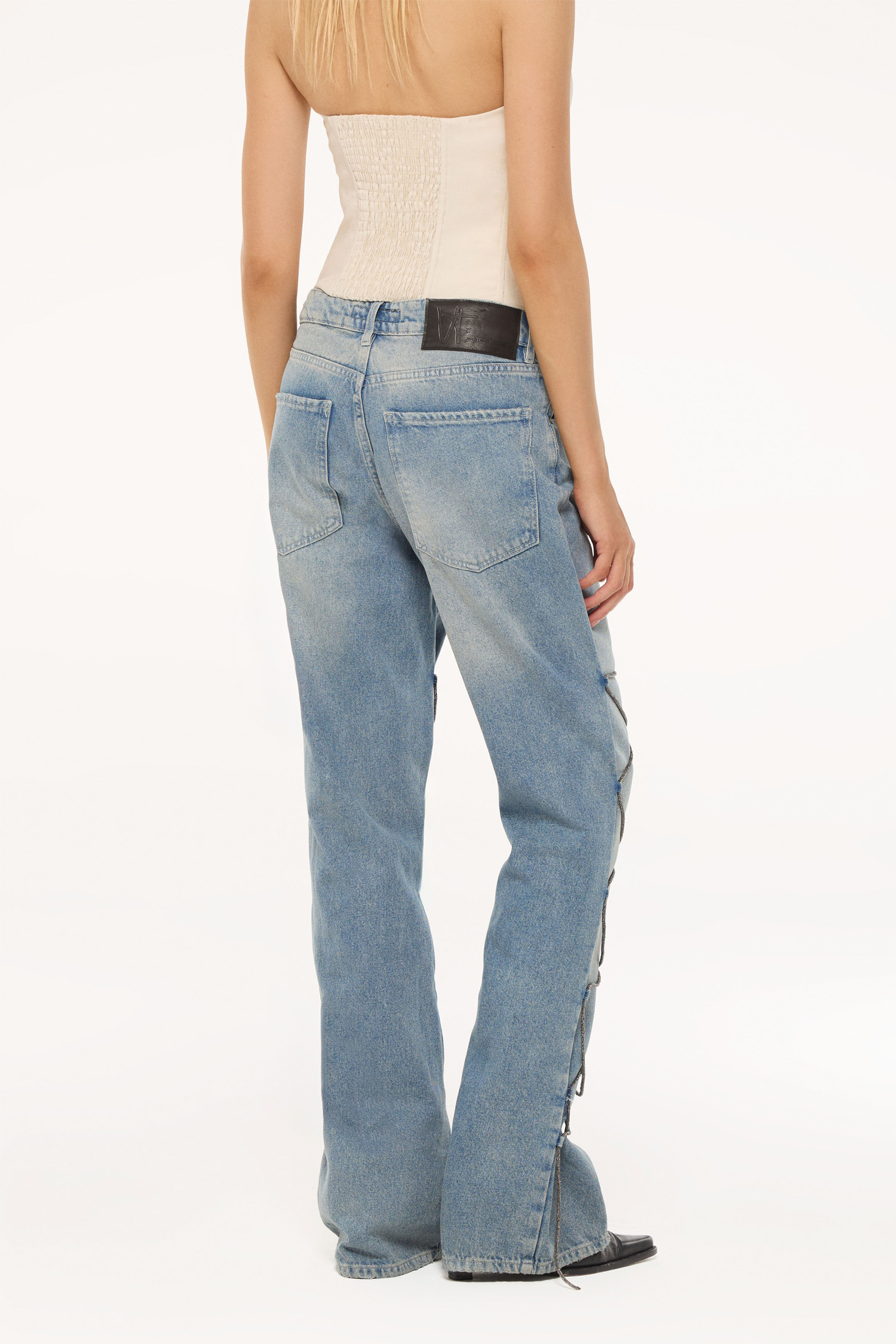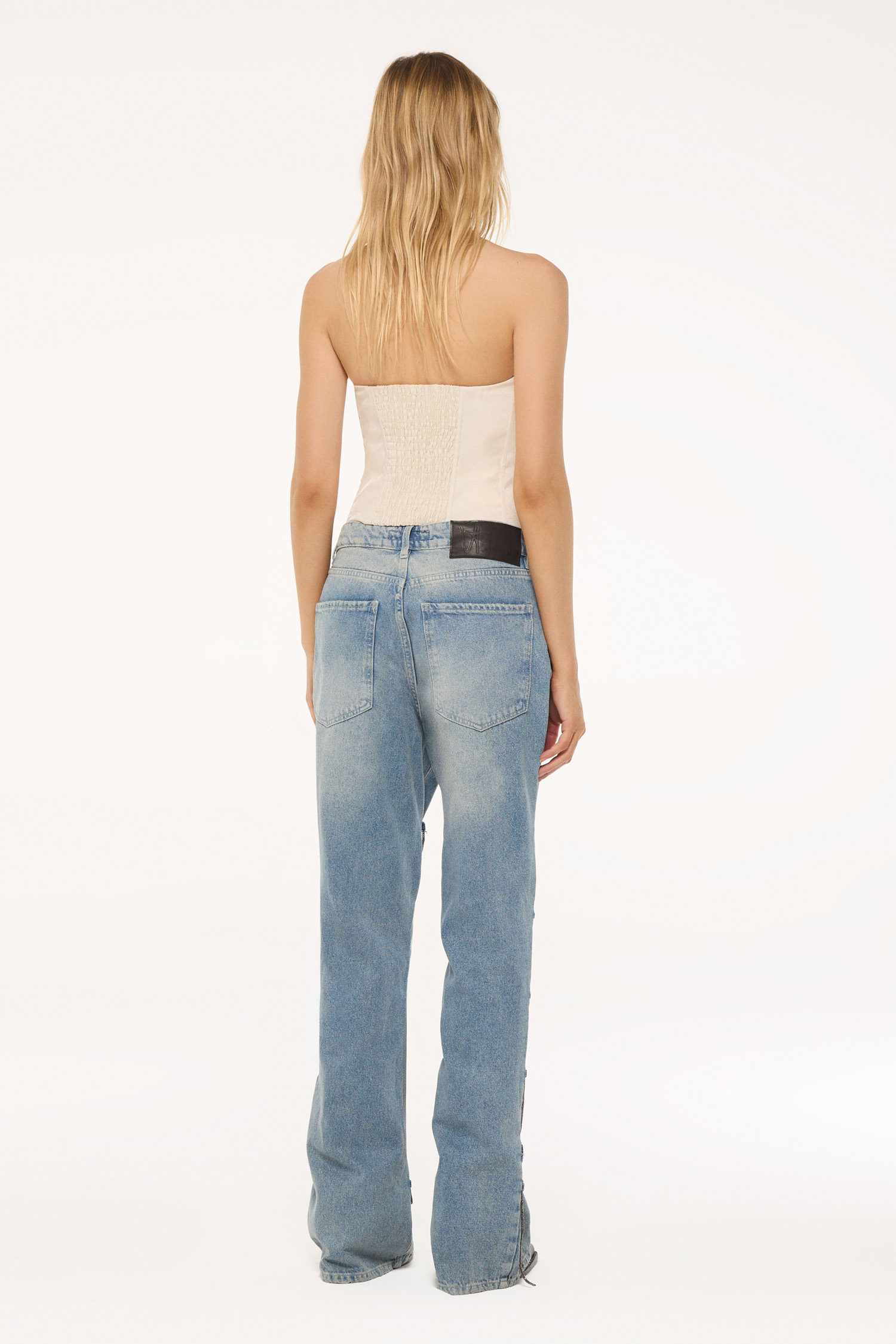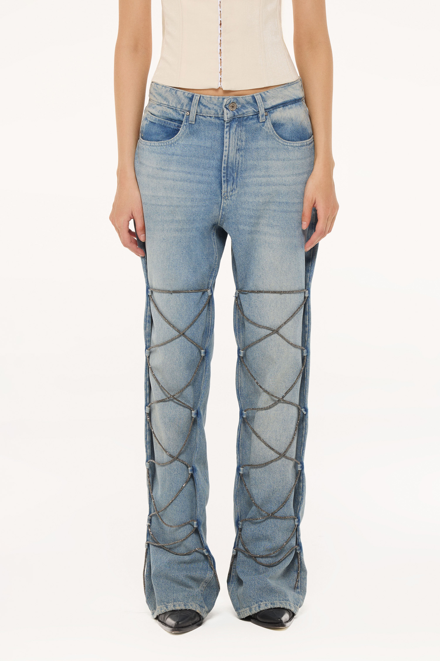 Pantalón de denim tiro alto fit straight confeccionado en tejido premium 100% algodón. Tiene un lavado indigo envejecido claro, con un efecto desgastado frontal. Su diseño único incorpora detalles decorativos con una cinta de strass, que rodea la pierna. Ideal para quienes aman diferenciarse. Botón, remaches y badana exclusivos de la marca.