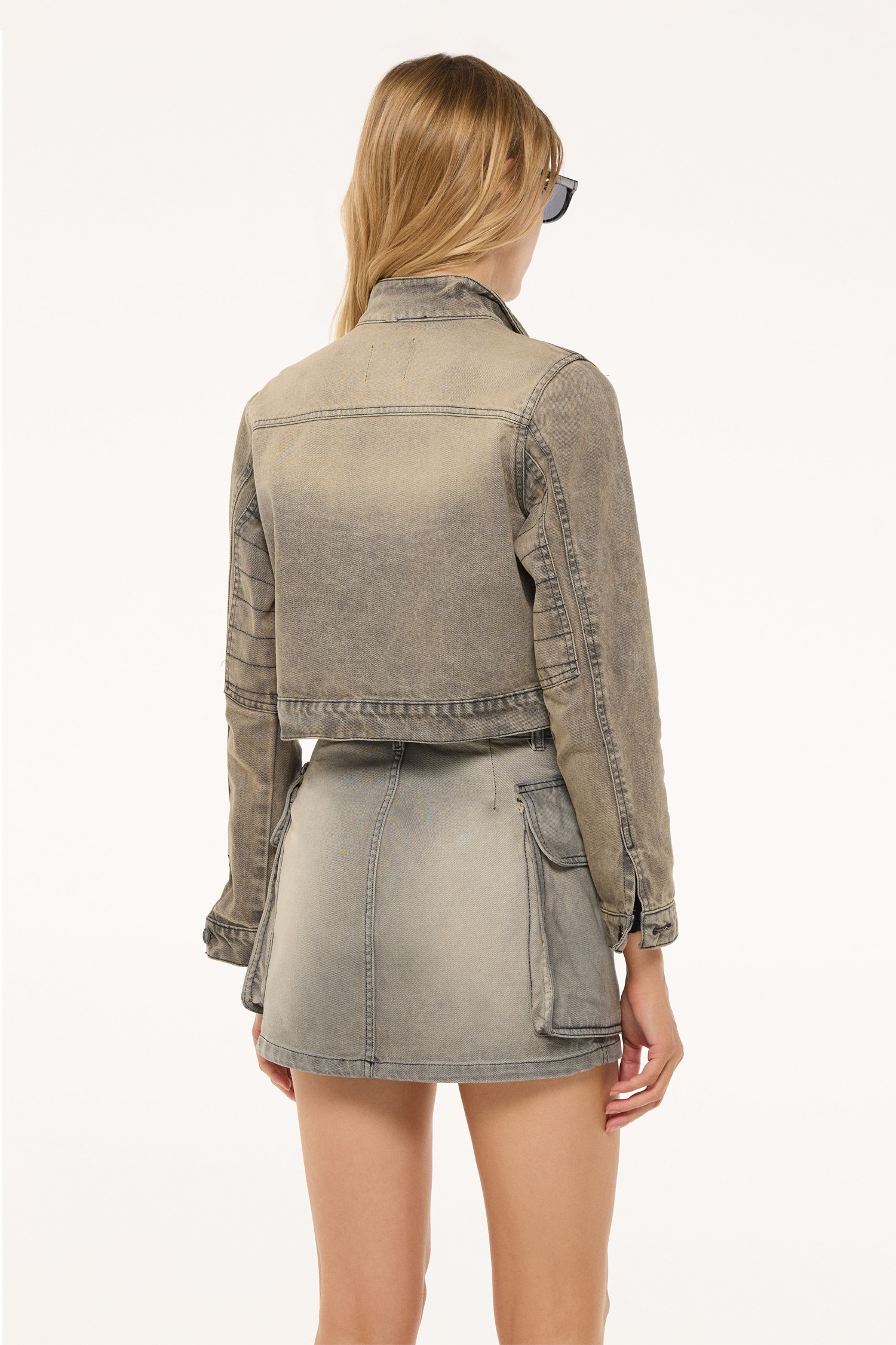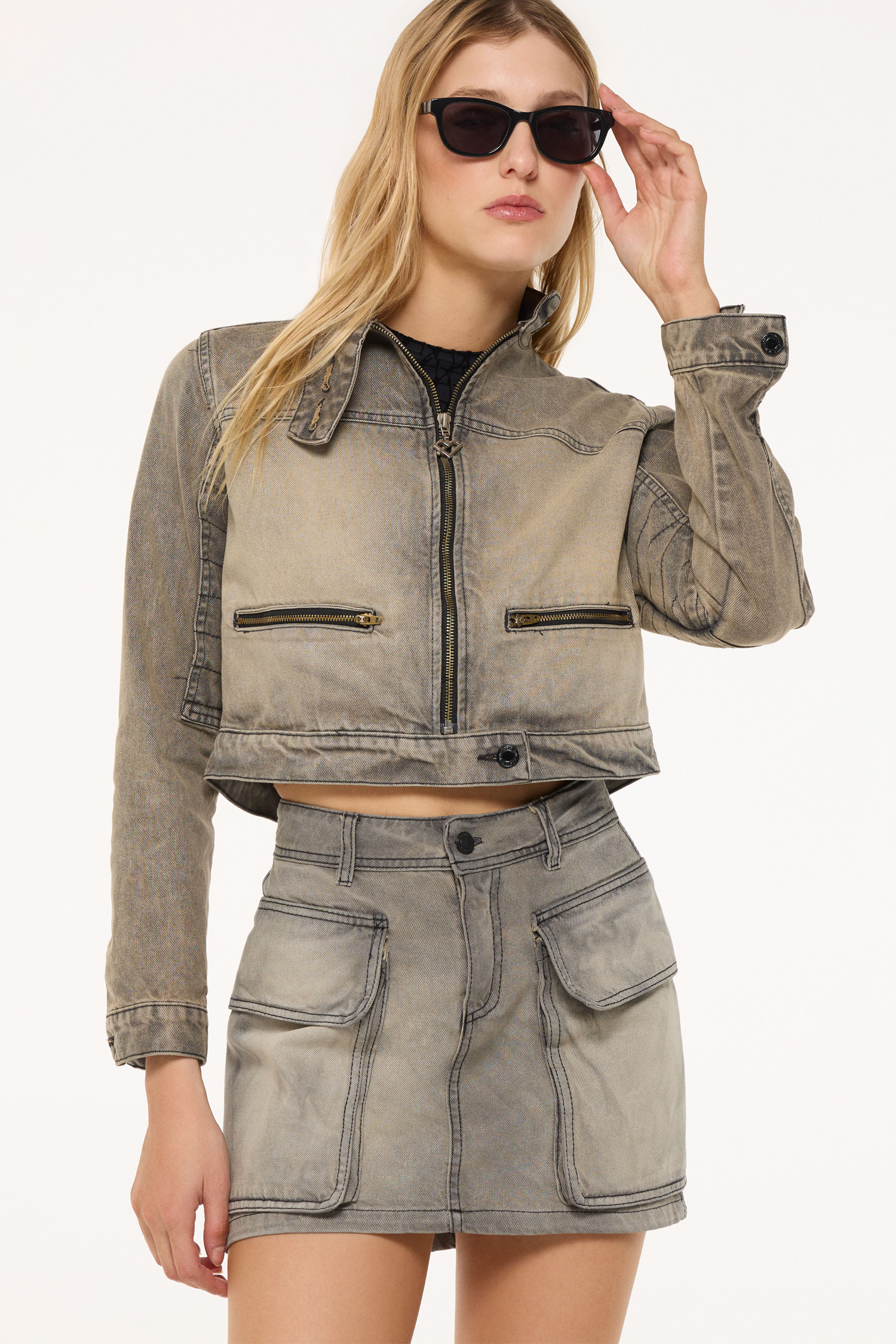 Campera de denim estilo biker confeccionada en tejido 100% algodón. Es un articulo diferenciado por sus detalles y sus recortes. Su lavado tiene un teñido desgastado en negro, con un matizado en tonos calidos que esta super en tendencia. Usálo en set con nuestra Mini Claus para un look increíble. Botón, remaches y badana exclusivos de la marca.