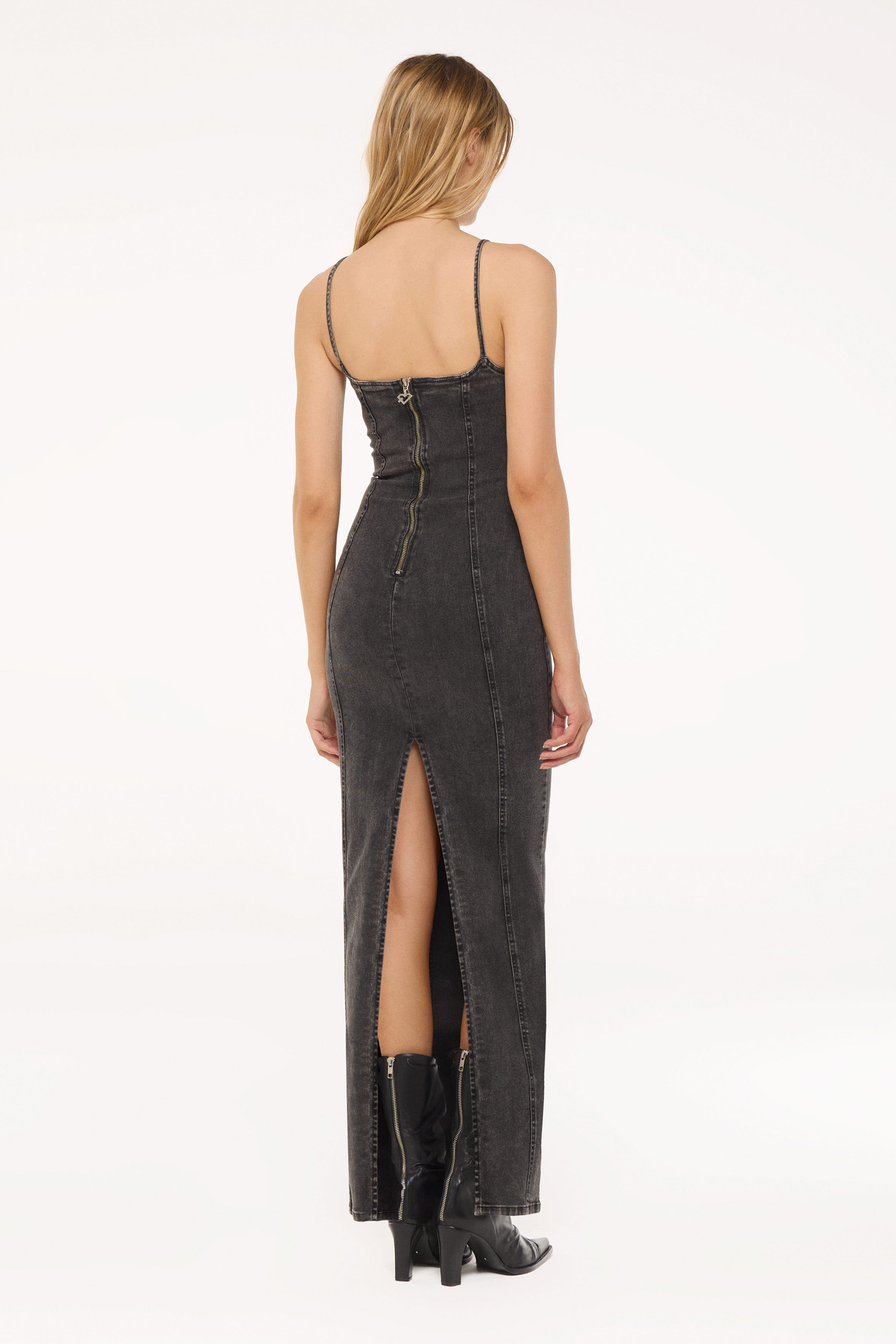 Vestido de denim al cuerpo largo con recortes. Tiene un cierre en la espalda y tejido premium con elastano que garantiza su calce sentador. Lavado gris oscuro con un leve matizado en tono marrón. Breteles finos para mayor comdidad. Lleva un customizado con strass, exclusivo de la marca.