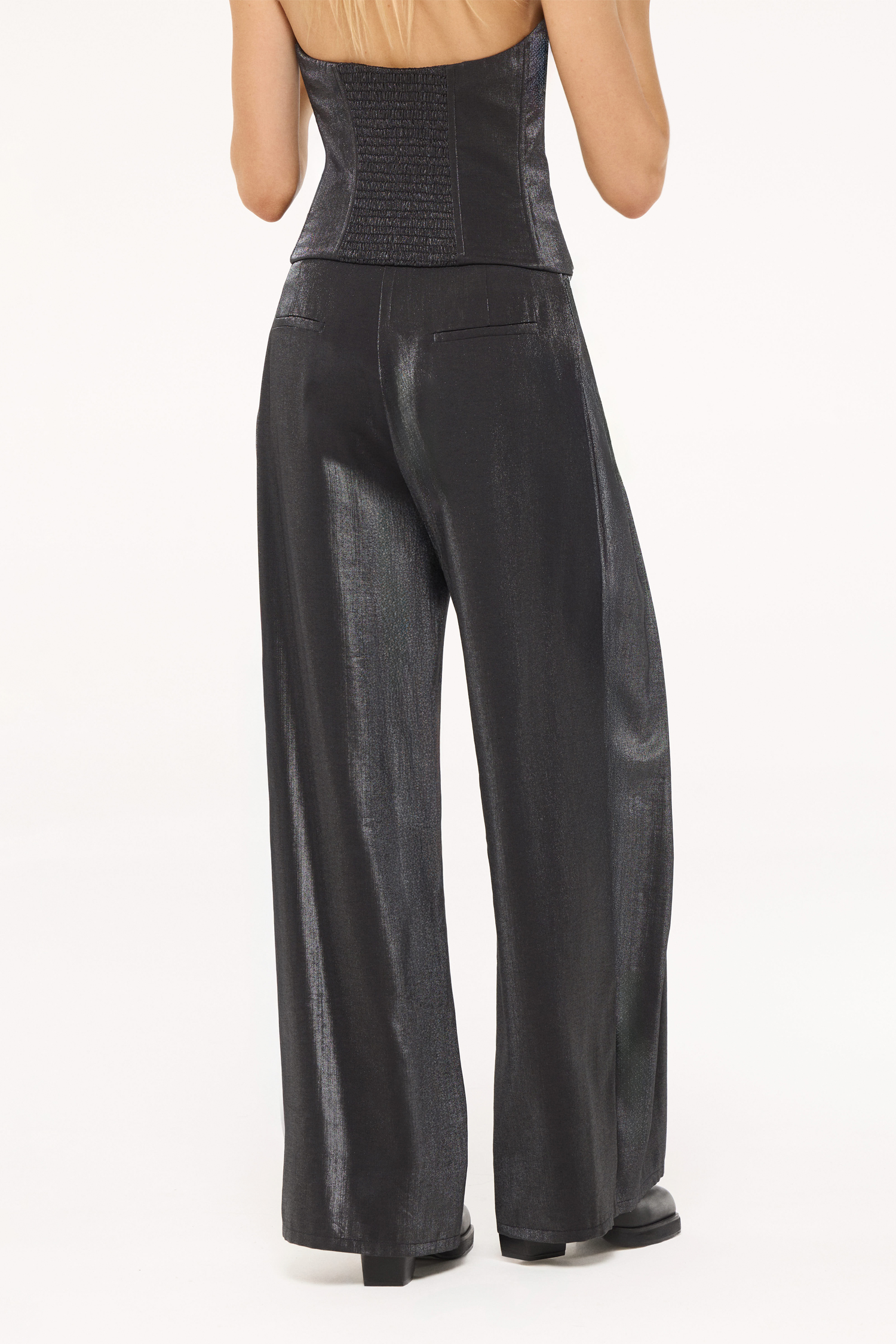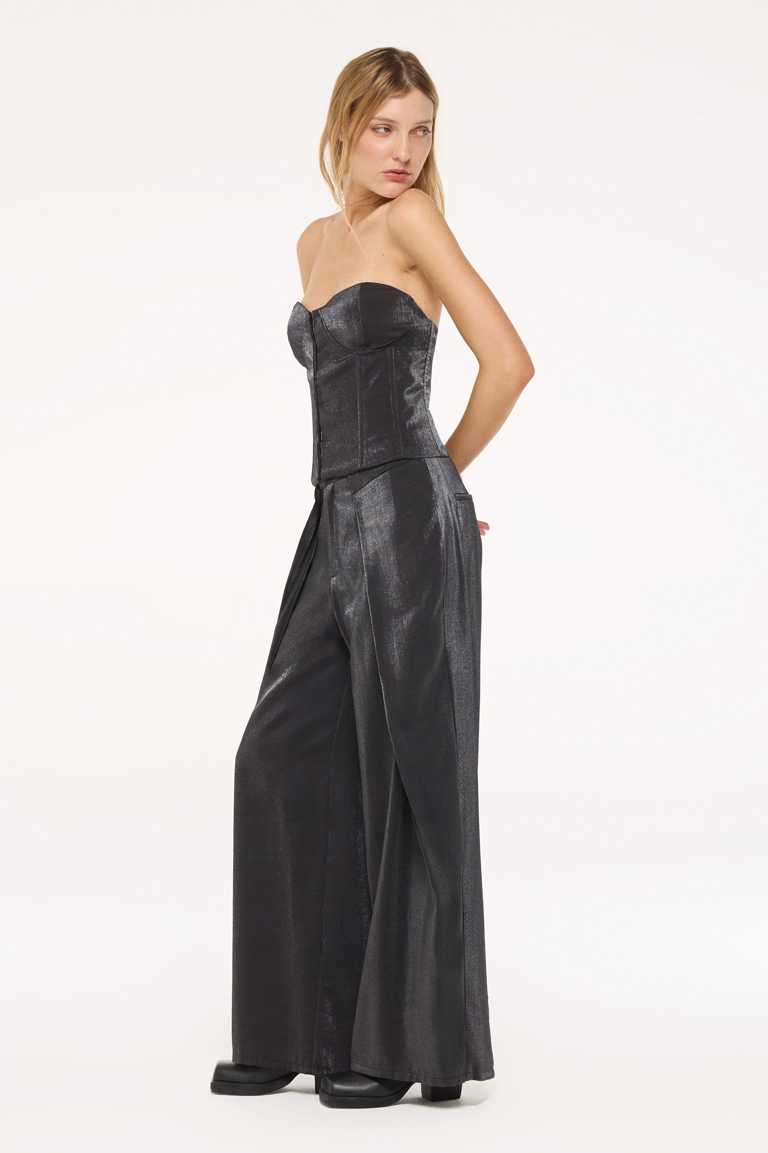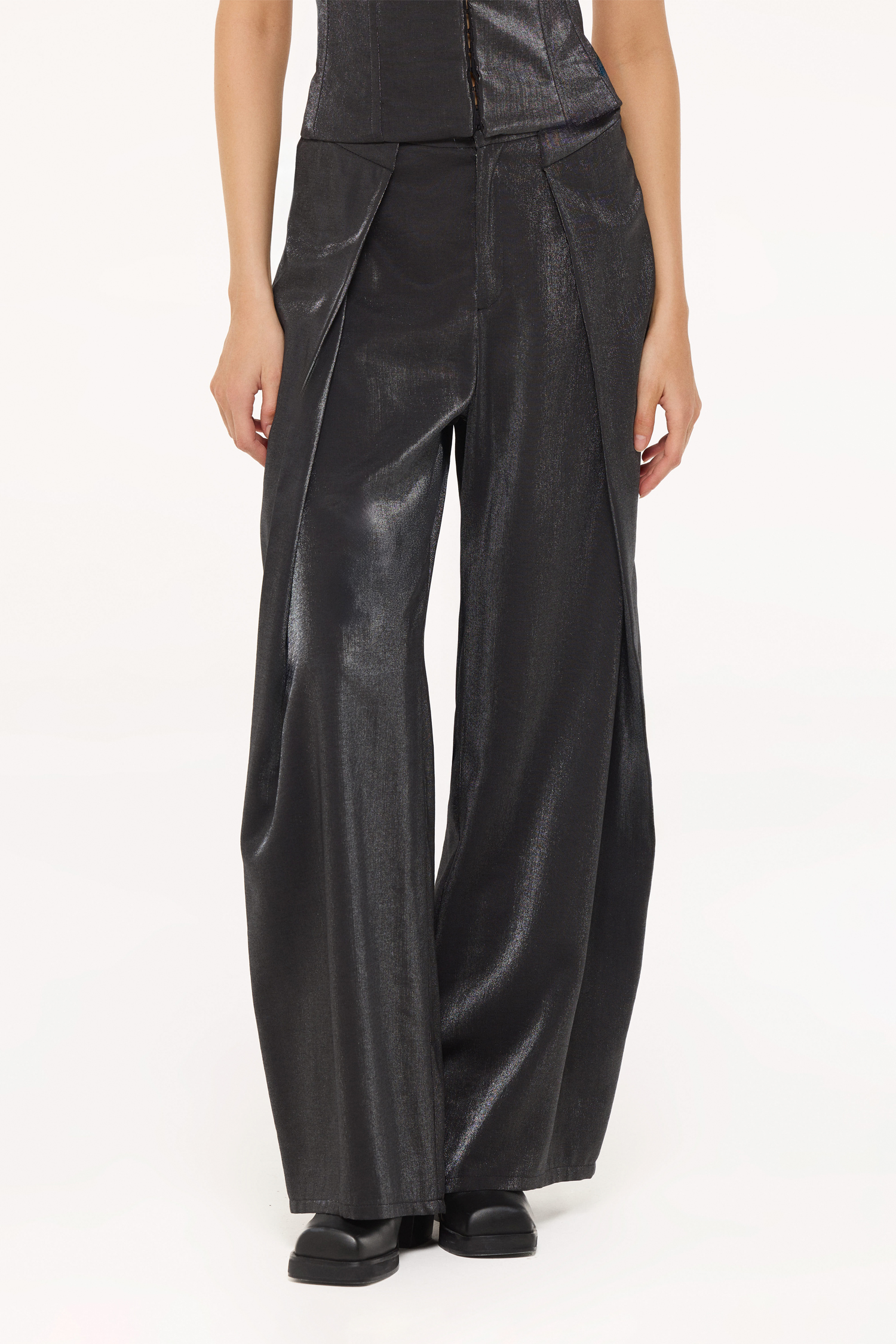 Elegante y versátil, este pantalón sastrero confeccionado en sastrero con leve brillo, es una prenda clave para armar looks de noche y sofisticados. Su calce relajado de pierna ancha y superposición asimetrica alargan visualmente la silueta, mientras que el tejido brillante lo convierte en un pantalón perfecto para salvarte en fiestas, salidas con amigas o cualquier evento nocturno