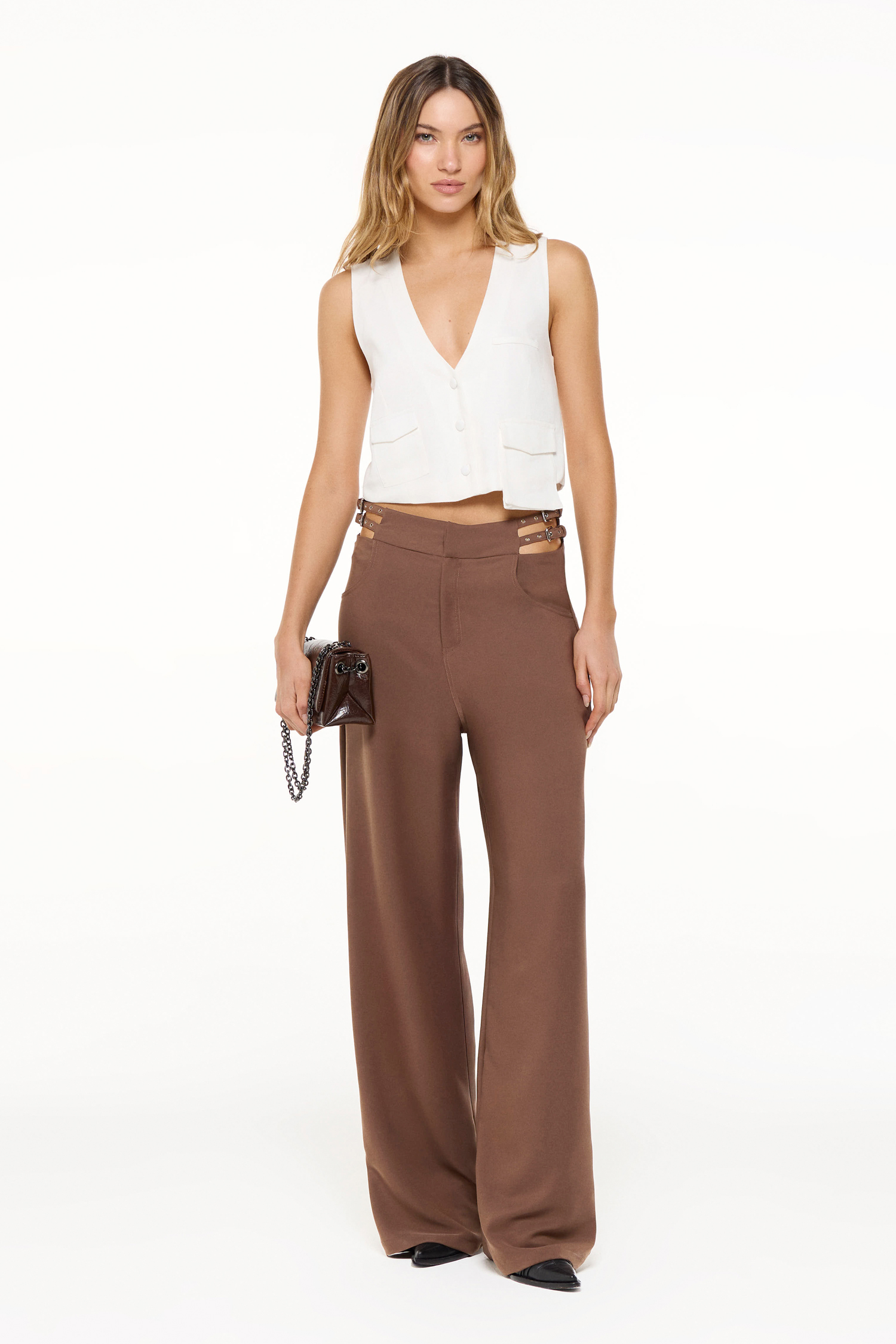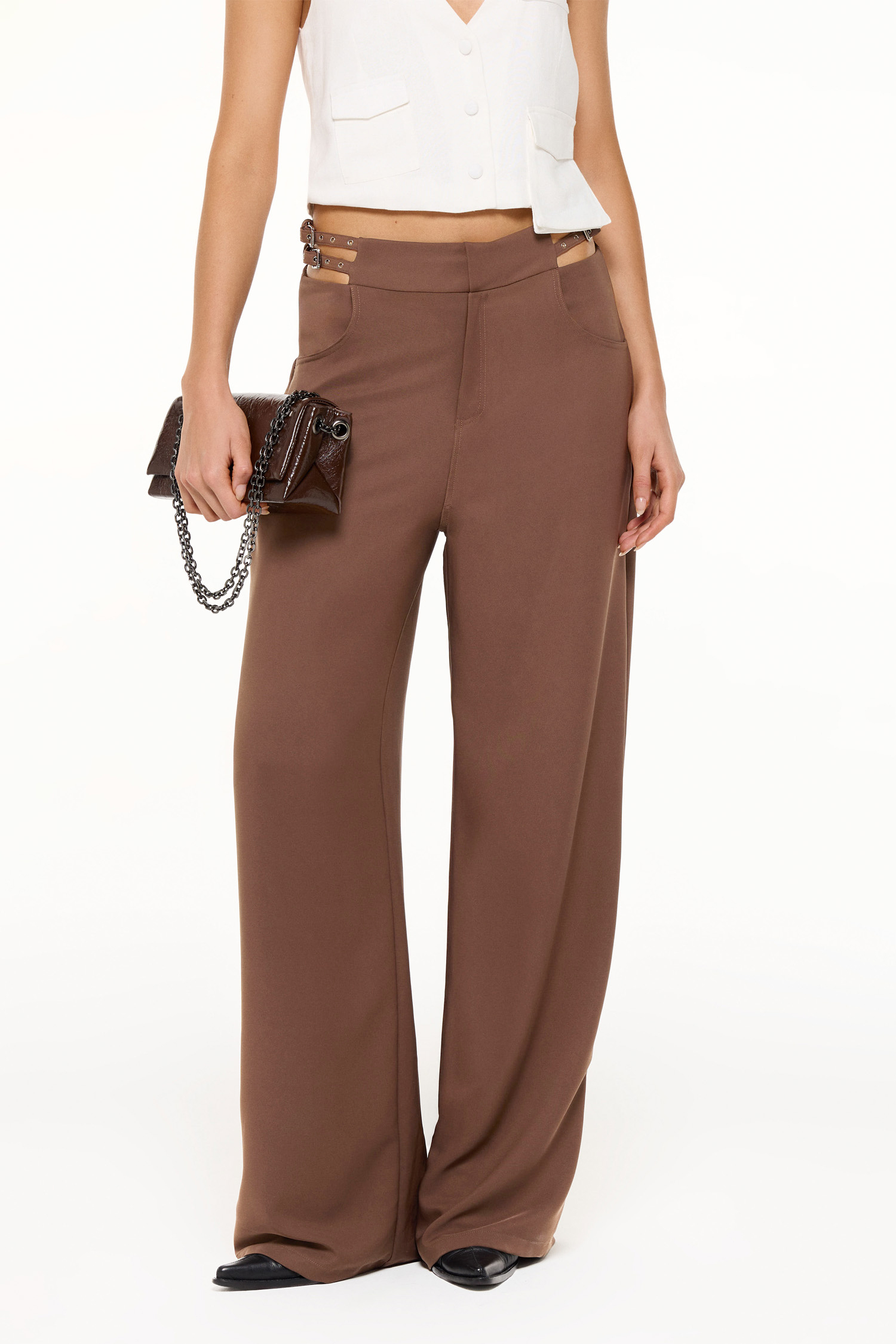 Nuestro pantalón Buckle esta confeccionado en una tela sastrera con una caida increible. Tiene fit recto y en su cintura tiene un detalle de cinturones con hebillas y ojalillos metálicos que lo hace súper especial y canchero.