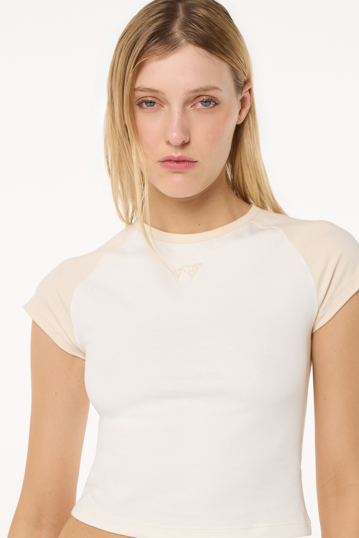 REMERA CONFECCIONADA EN ALGODÓN CON ELASTANO. SUS MANGAN VAN EN COMBINACIÓN DE COLOR QUE HACEN MATCH CON LA ESTAMPA QUE TIENE EN SU FRENTE