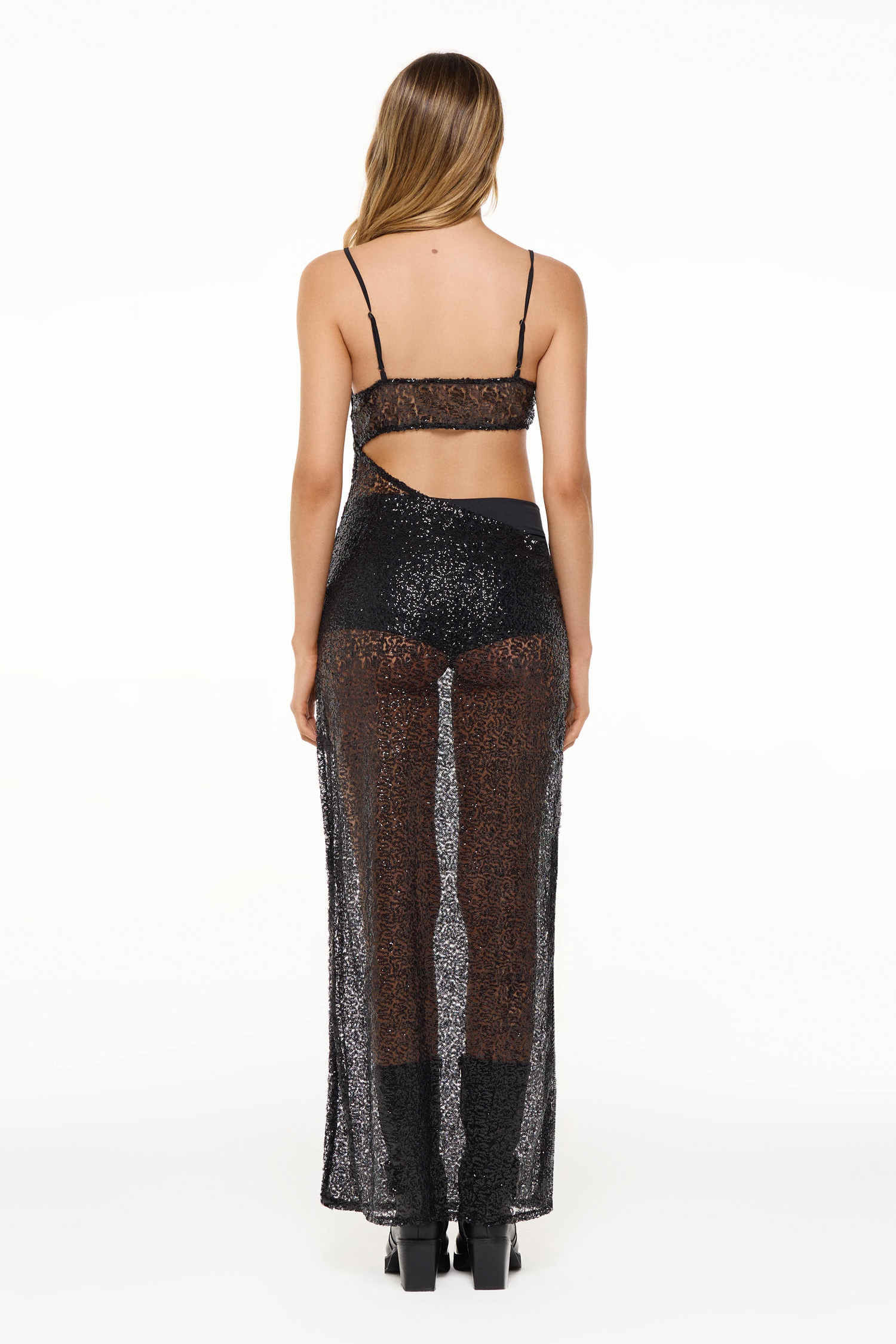 VESTIDO CONFECCIONADO EN UN ENCAJE BORDADO CON LENTEJUELAS. SU ESPALDA DESCUBIERTA LO HACE SÚPER ATRACTIVO PARA FIESTAS O EVENTOS ESPECIALES.