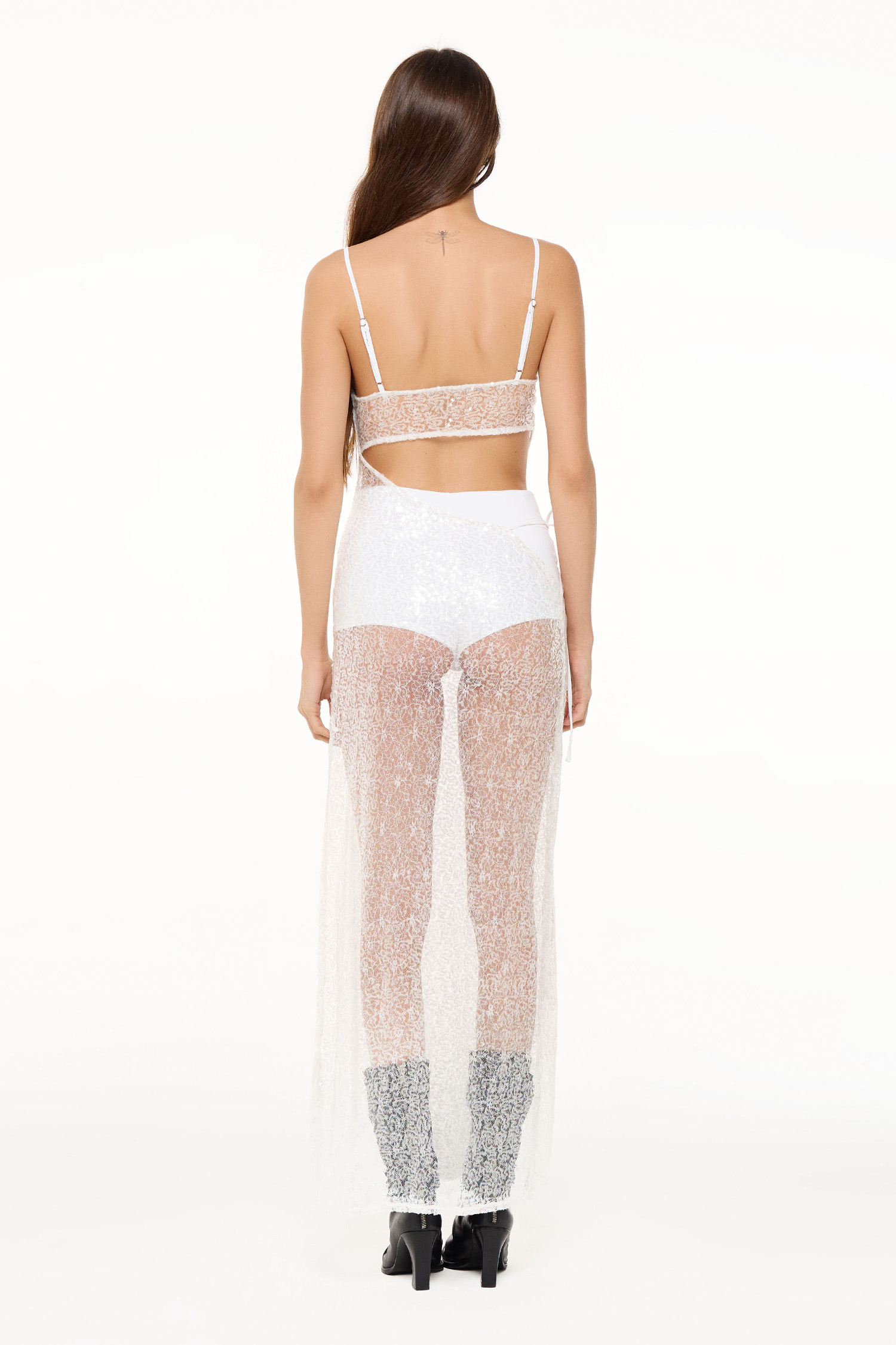 VESTIDO CONFECCIONADO EN UN ENCAJE BORDADO CON LENTEJUELAS. ADEMAS, POSEE UN MICRO SHORT PARA COMPLETAR EL LOOK. SU ESPALDA DESCUBIERTA LO HACE SÚPER ATRACTIVO PARA FIESTAS O EVENTOS ESPECIALES.