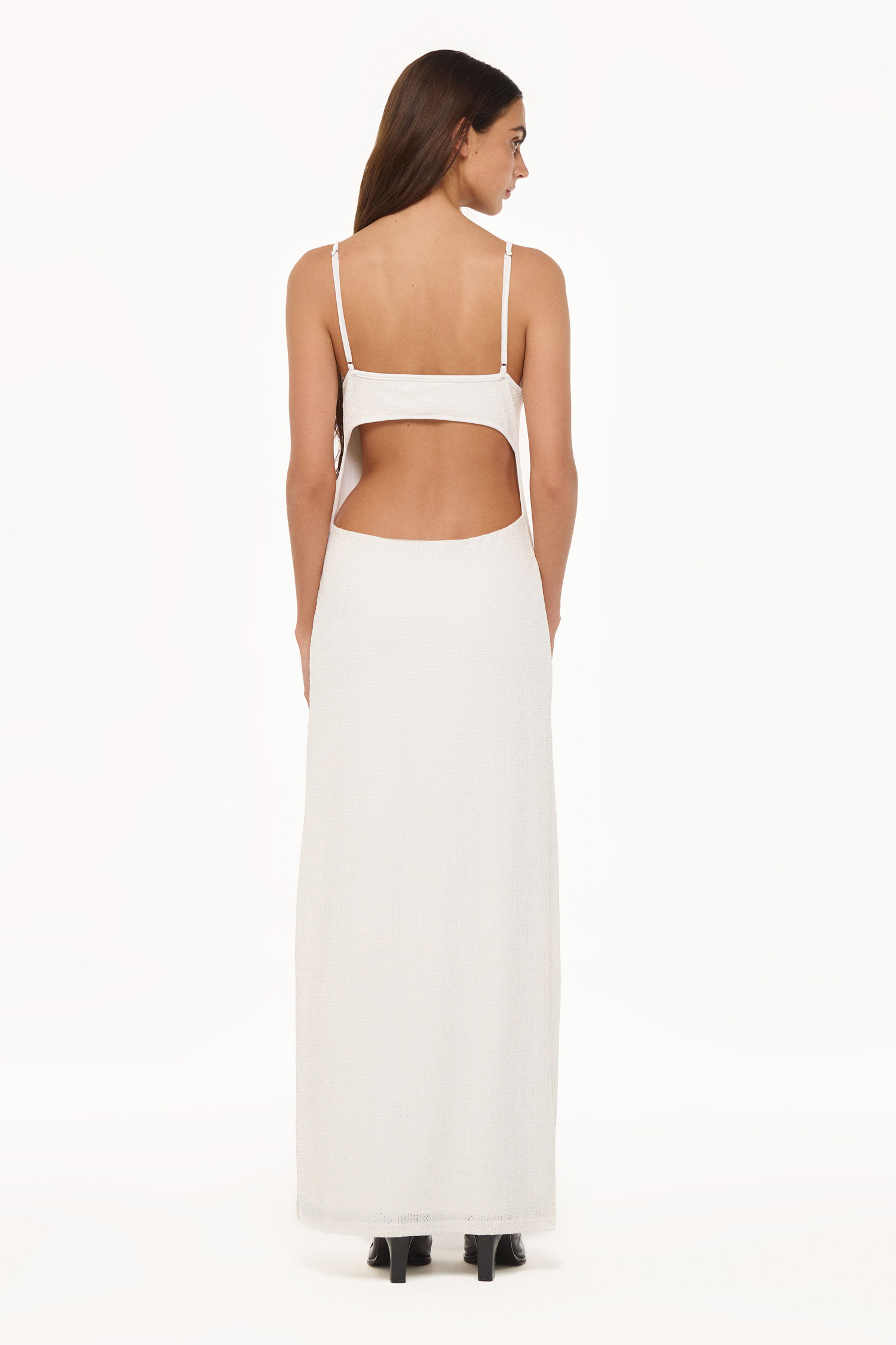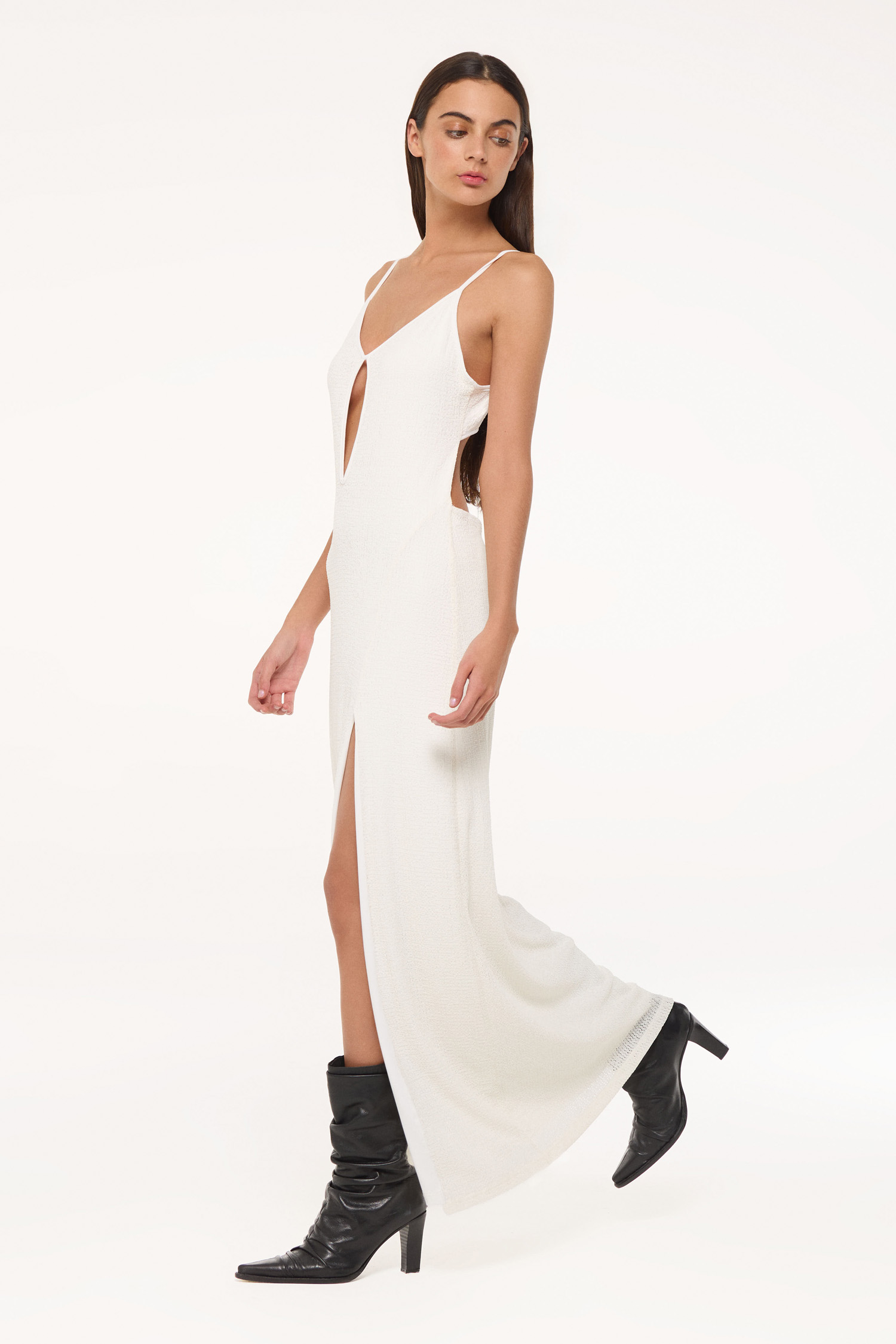 Este vestido largo de tela con textura de red con escote en V y tajo central es la prenda salvadora para tus noches de verano. Ultra liviano, fresco, con breteles finitos y un fit relajado que te lookea en un segundo . Este vestido es ideal para usar arriba de la bikini o con sandalias y accesorios para lookearte de noche